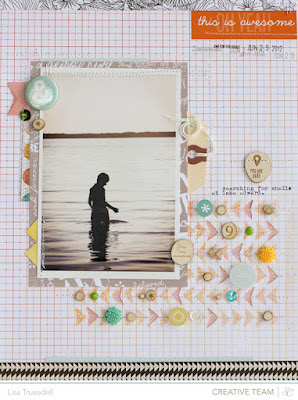 Já jsem si udělala stránku v "mých" barvách - růžové, šedé a modré. Použila jsem svoji oblíbenou pěnovou abecedu od Amy Tangerine a její papíry z minulé kolekce Sketchbook. Nemohla jsem vynechat můj naprosto nejoblíbenější materiál - velum, a novou lásku - enamelové tečky.