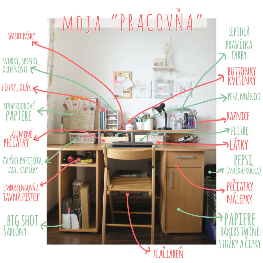 Veci mám roztriedené podľa kategórií, uložené sú väčšinou v menších škatuľkách alebo košíkoch a na najmenšie veci mám najradšej priesvitné nádobky. Je praktické mať všetko poruke - všetko mám na dosah ruky a pri tvorení nemusím chodiť ďaleko. I keď by mi nevadilo mať jedného dňa mega scrap miestnosť ako v Amerike :D